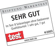 Solaranlage erwärmt nicht nur das Trinkwasser, sie unterstützt auch die Heizung. Die STIFTUNG WARENTEST untersuchte diese Kombianlagen erstmals in einem vollständigen Test (test 4/2003). Knecht erreichte mit seinem Solarpaket SH 1440-AR als einziger ein „sehr gut“ und den 1. Platz von acht Anlagen ohne Gasbrenner! Unser Testergebnis auf einen Blick: