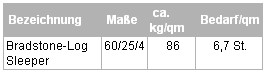 Wer sich Bradstone-Log Sleeper erstmals genauer anschaut, wird es kaum für möglich halten. Erst bei Berührung spürt man, daß es sich bei den scheinbaren Holzbohlen um perfekte und besonders attraktive Nachbildungen aus Beton handelt. Bradstone-Log Sleeper wirken dabei wie natürlich gealtert. Sonne, Wasser und Abnutzung haben aber nur scheinbar ihre Spuren hinterlassen. Denn sie können diesen Platten in Wirklichkeit gar nichts anhaben. Bradstone-Log Sleeper sind die dauerhafte, langlebige und einfach zu verareitende Alternative zu den früher gerne verwendeten Eisenbahnschwellen. Die Verarbeitung ist genauso bequem wie bei normalen Außenplatten.