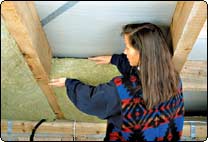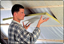 Nach dem Zuschneiden klemmt man die einzelnen Pass-Stücke der Klemmrock einfach zwischen die Sparren. Eine zusätzliche Befestigung ist nicht notwendig. Dank der hohen Formstabilität passt sich die Klemmrock konturgenau den Sparren an.