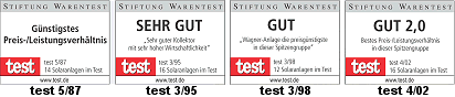 Solaranlage erwärmt nicht nur das Trinkwasser, sie unterstützt auch die Heizung. Die STIFTUNG WARENTEST untersuchte diese Kombianlagen erstmals in einem vollständigen Test (test 4/2003). Knecht erreichte mit seinem Solarpaket SH 1440-AR als einziger ein „sehr gut“ und den 1. Platz von acht Anlagen ohne Gasbrenner! Unser Testergebnis auf einen Blick: